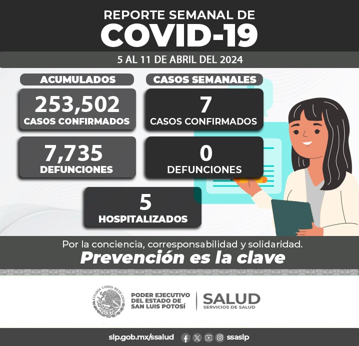 Del 5 al 11 de abril del 2024, se registraron siete nuevos casos  y cero defunciones por Covid.