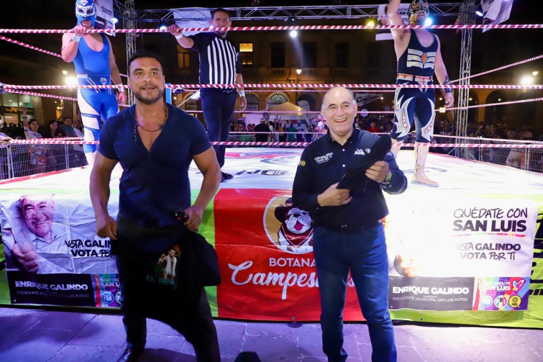 El candidato a la alcaldía por la coalición conformada por PAN, PRI y PRD, Enrique Galindo Ceballos, se comprometió a dar continuidad a las acciones de impulso al deporte en todos los niveles, principalmente el popular, con actividades gratuitas, como la función de lucha libre que ofreció ayer por la tarde en la Plaza de los Fundadores, estelarizada por Alberto El Patrón, el mejor luchador potosino de los últimos años; Metalik, triunfador en México, Estados Unidos y Japón; y lo mejor de la baraja luchística en San Luis Potosí; quienes deleitaron con un espectáculo gratuito y de gran calidad a miles de aficionados reunidos en la Plaza de los Fundadores.