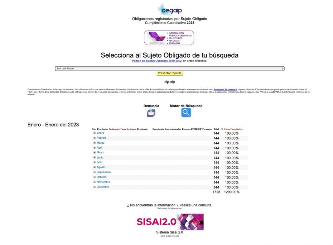 La Unidad de Transparencia del Ayuntamiento de San Luis Potosí informa que la administración municipal cuenta con un 100 por ciento de cumplimiento cuantitativo en la información publicada en la Plataforma Estatal de Transparencia de la Comisión Estatal de Garantía de Acceso a la Información Pública del Estado (Cegaip).