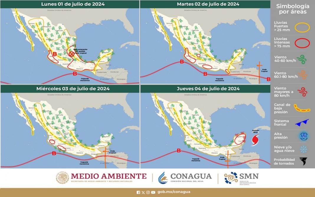 A partir del jueves, los pronósticos de trayectoria, indican que el huracán Beryl se aproximará a la Península de Yucatán, incrementando la probabilidad de lluvias y vientos intensos en dicha península. Se mantiene en estrecha vigilancia.