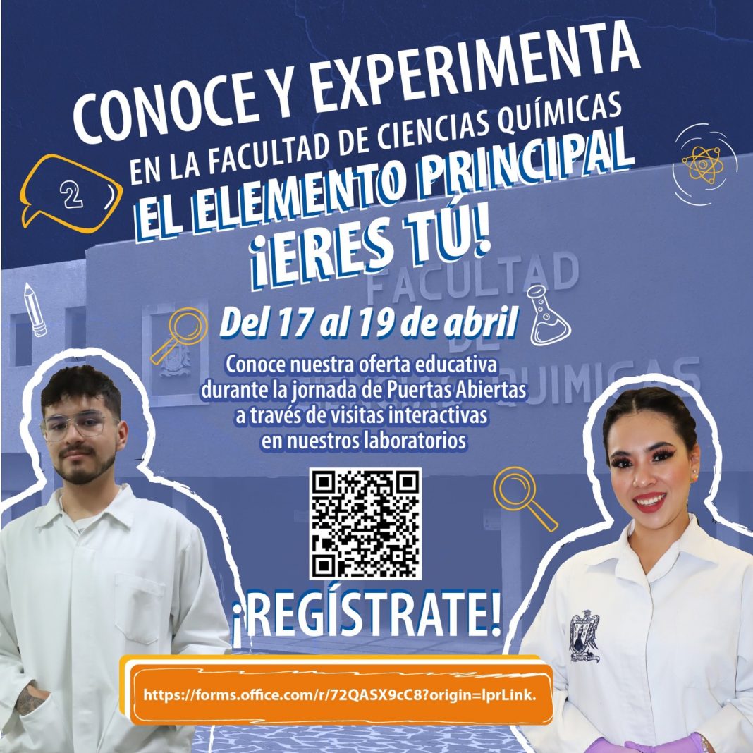 A través de visitas interactivas a los laboratorios de la Facultad de Ciencias Químicas (FCQ) de la Universidad Autónoma de San Luis Potosí (UASLP), las y los estudiantes de preparatoria podrán conocer la oferta educativa del plantel durante la jornada de Puertas Abiertas “El elemento principal ¡Eres tú!”, que se realizará del 17 al 19 de abril, de las 11:00 a las 15:00 horas.