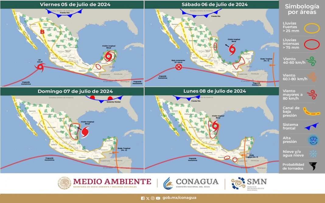 Este día, el ciclón tropical Beryl tocó tierra a las 05:05 horas como huracán de categoría 2 al norte de Tulum, Quintana Roo, recorrerá el norte de la Península de Yucatán e ingresará esta tarde al Golfo de México, ocasionará lluvias puntuales torrenciales en Campeche, Yucatán y Quintana Roo, y puntuales intensas en Chiapas y Tabasco, todas acompañadas de descargas eléctricas, las cuales podrían generar encharcamientos en la Península de Yucatán, así como deslaves o inundaciones y crecida de ríos en Chiapas y Tabasco. Asimismo, se pronostican vientos con rachas de 110 a 130 km/h en Campeche, Yucatán y Quintana Roo y oleaje de 3 a 5 metros de altura con posible formación de trombas marinas en sus costas. Por otra parte, un canal de baja presión que se extiende a lo largo de la Sierra Madre Occidental, hasta el centro del país, en interacción con inestabilidad en altura, generarán chubascos y lluvias puntuales fuertes a muy fuertes en el noroeste, norte, occidente, centro, oriente y sur de la República Mexicana.