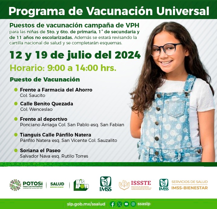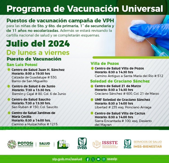 Durante el mes de julio se instalarán puestos de vacunación contra VPH en puntos estratégicos de la capital potosina, Soledad y Villa de Pozos, visita redes sociales de los Servicios de Salud.