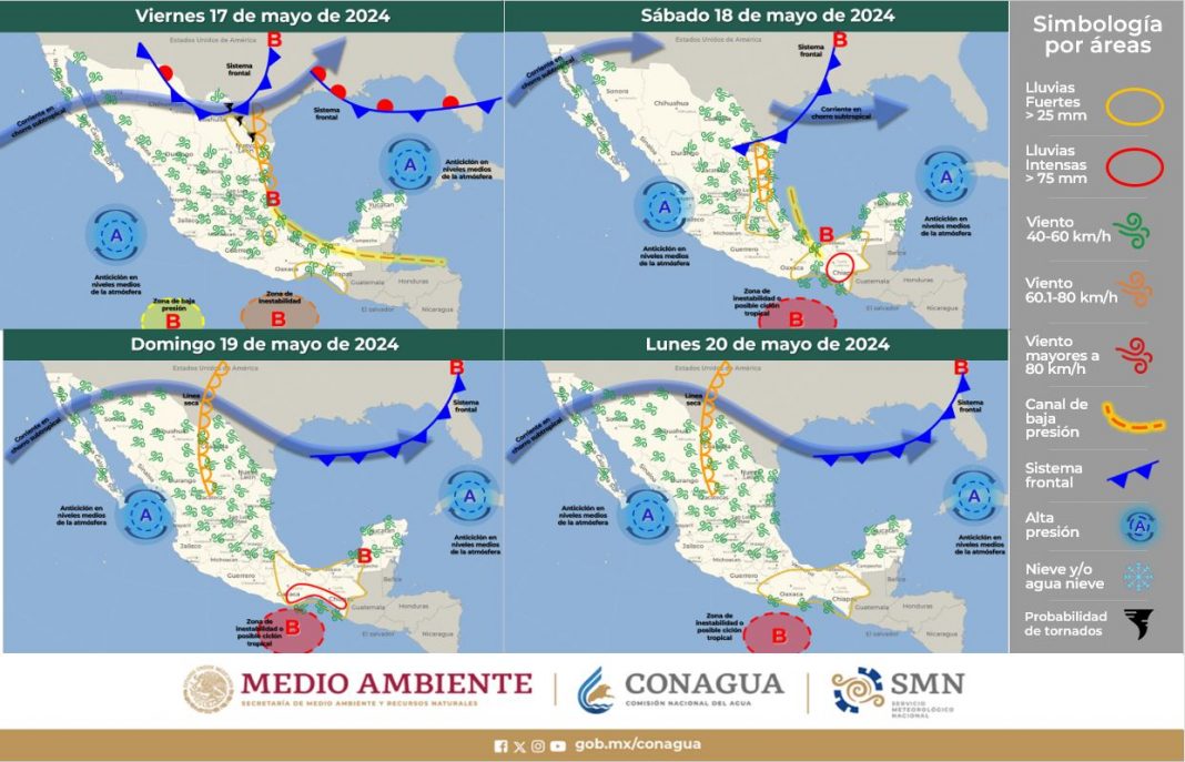 Finalmente, la Conagua y el Servicio Meteorológico Nacional exhortan a la población a mantenerse informada sobre las condiciones meteorológicas mediante las páginas de internet www.gob.mx/conagua y http://smn.conagua.gob.mx, en las cuentas de X @conagua_mx y @conagua_clima y de Facebook www.facebook.com/conaguamx, así como en la aplicación para dispositivos móviles ConaguaClima, donde se puede consultar el pronóstico por municipios.