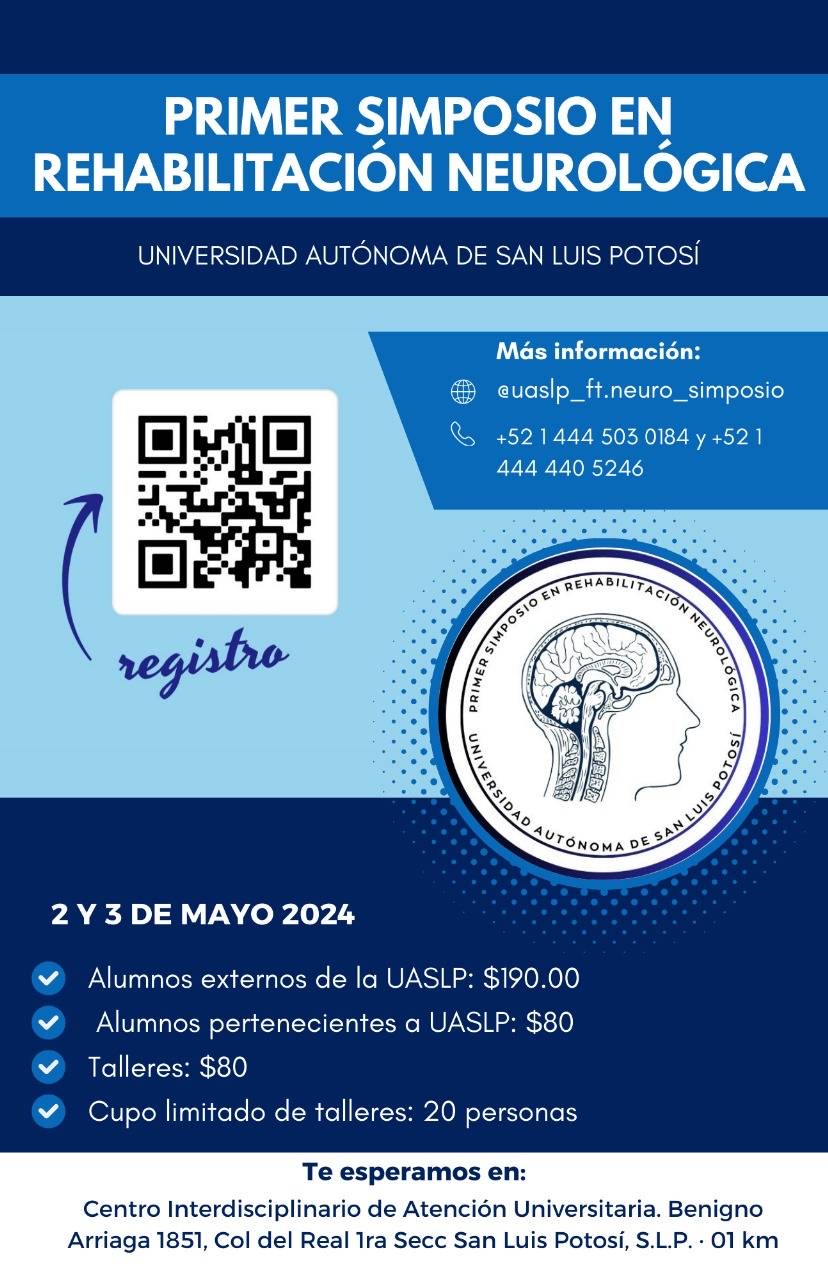 La Universidad Autónoma de San Luis Potosí (UASLP) a través del Centro Interdisciplinario de Atención Universitaria, llevará a cabo el Primer Simposio de Rehabilitación Neurológica los días 02 y 03 de mayo de 2024, mismo que se llevará a cabo en las instalaciones del CIAU, ubicadas en Francisco Peña esquina con Benigno Arriaga. Col Del Real.