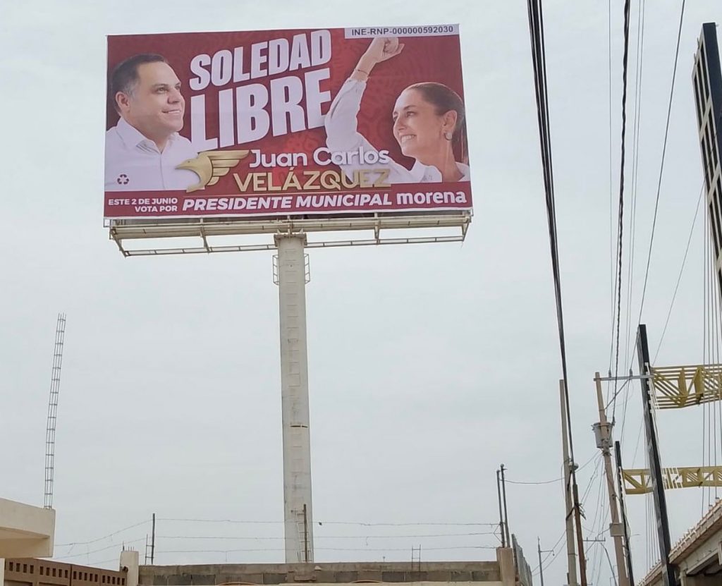 La madrugada de este miércoles 8 de mayo, fue bajado un espectacular de Juan Carlos Velázquez, candidato de Morena a la alcaldía de Soledad de Graciano Sánchez