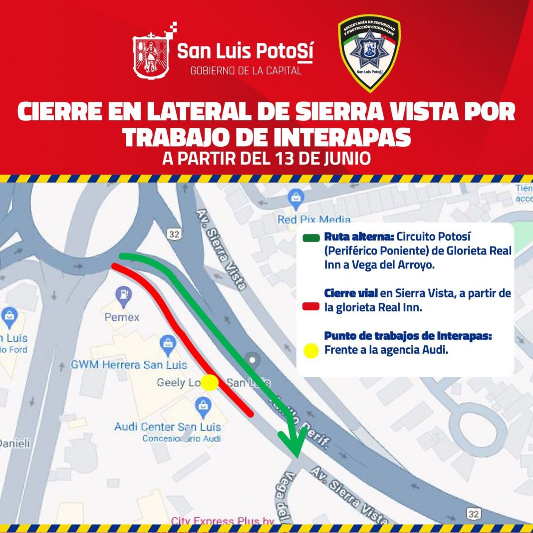 Al ser una zona altamente transitada, la Dirección General de Policía y Movilidad ha habilitado como ruta alterna el tramo de Circuito Potosí, de glorieta Real Inn a calle Vega del Arroyo.