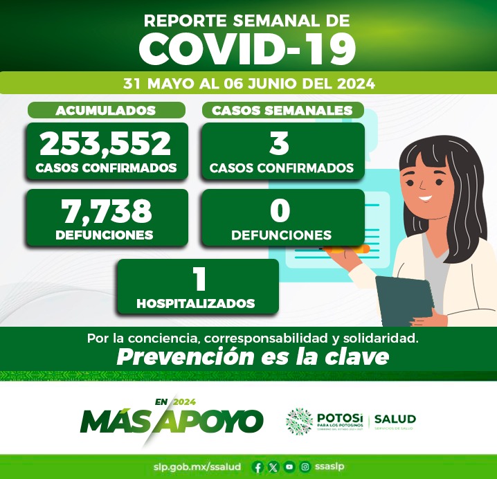 Del 31 mayo al 06 de junio del presente año, se registraron tres nuevos contagios de COVID-19 confirmando el Comité Estatal para la Seguridad en Salud y los Servicios de Salud 253 mil 552 casos totales de esta enfermedad.