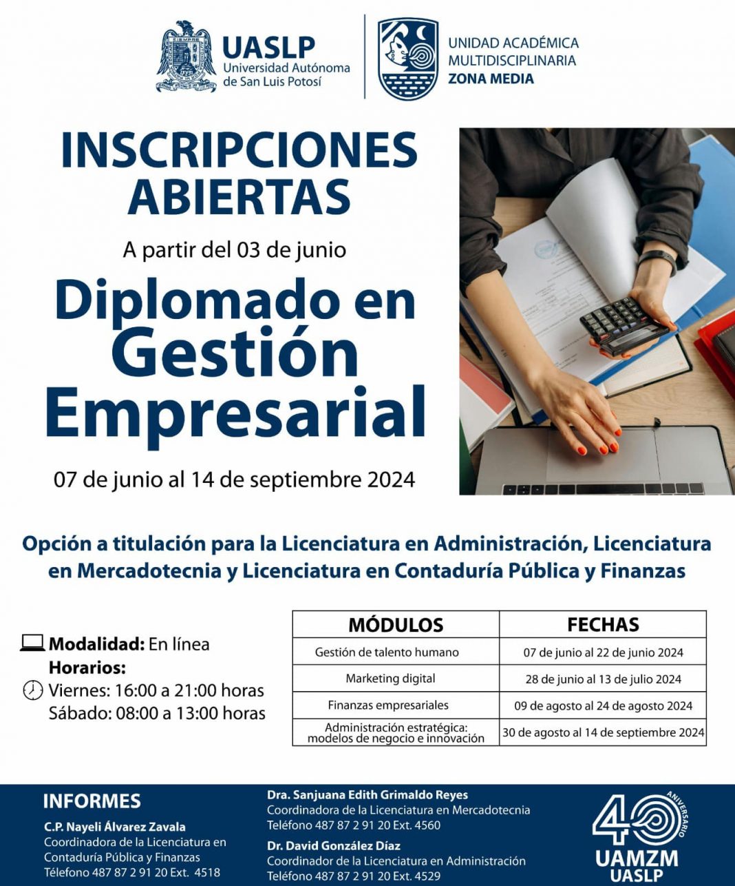 Con el propósito de continuar con la formación profesional y aprovechar la tecnología, la Unidad Académica Multidisciplinaria Zona Media (UAMZM) de la Universidad Autónoma de San Luis Potosí (UASLP), ofrece el Diplomado en Gestión Empresarial, informó el Dr. David Gómez Sánchez, secretario académico del campus Rioverde y coordinador del diplomado.