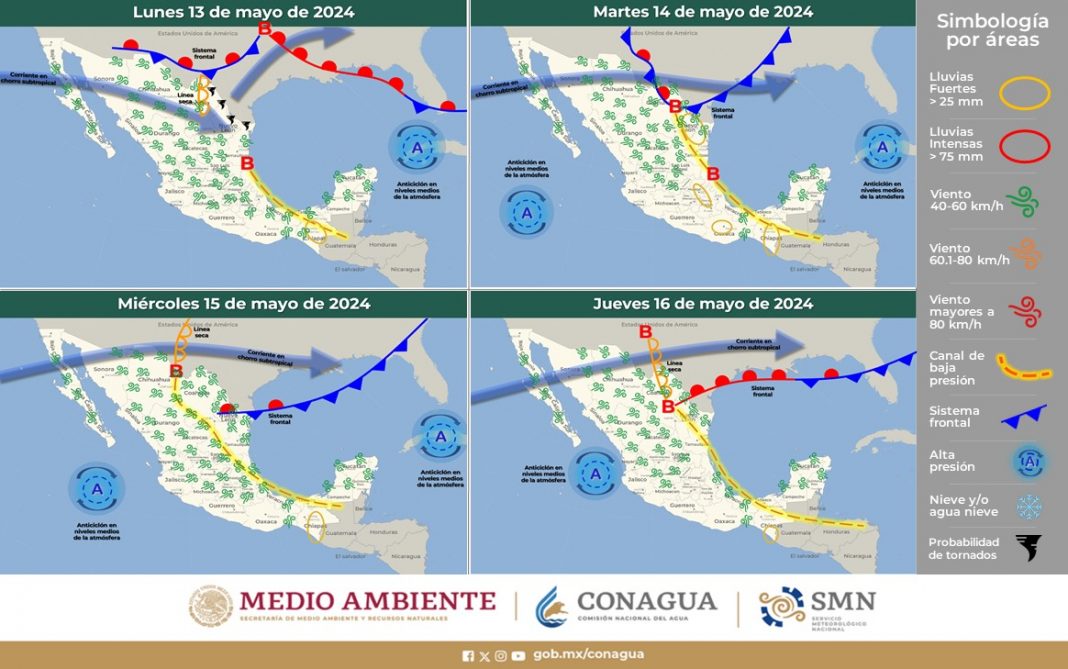 Finalmente, la Conagua y el Servicio Meteorológico Nacional exhortan a la población a mantenerse informada sobre las condiciones meteorológicas mediante las páginas de internet www.gob.mx/conagua y http://smn.conagua.gob.mx, en las cuentas de X @conagua_mx y @conagua_clima y de Facebook www.facebook.com/conaguamx, así como en la aplicación para dispositivos móviles ConaguaClima, donde se puede consultar el pronóstico por municipios.