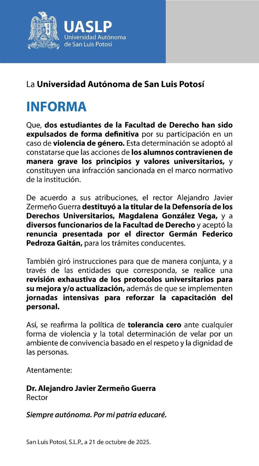 La Universidad Autónoma de San Luis Potosí (UASLP) informó la expulsión definitiva de dos alumnos de la Facultad de Derecho por su participación en un caso de violencia de género.