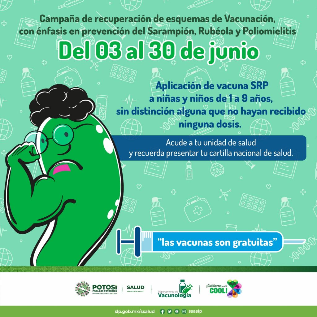 En San Luis Potosí no hay hasta el momento casos positivos ni sospechosos de sarampión, pero para evitar el resurgimiento de la enfermedad en el estado, es necesario cubrir el esquema básico de vacunación a niñas y niños, por lo que los Servicios de Salud invitan a padres, madres y cuidadores a llevar a infantes a vacunar a su unidad de salud más cercana durante el mes de junio.